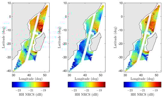SMAP 1 km high-resolution measured and modeled backscatter NRCS maps for passes 02260_D shown in Figure 16. From (left) to (right): SMAP, wind-only model, and wind and swell model.