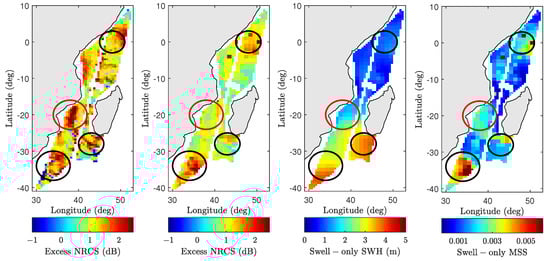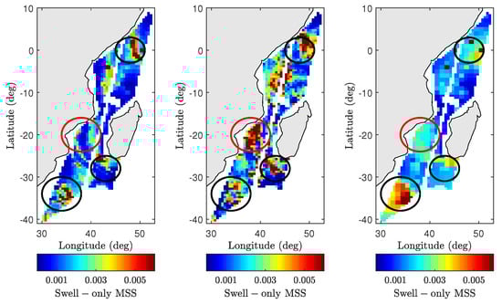 where x and y represent the excess MSS and excess NRCS, respectively. Note that all polynomials traverse through () = () indicating no excess NRCS predictions in the absence of excess MSS. The leading-edge definition used above predicts the smallest possible excess MSS for a given excess NRCS observation. As shown in Figure 18, the excess NRCS is first computed by subtracting wind-only TSM predictions from wind + swell model predictions and SMAP observations. Equation (40) can then be inverted iteratively to find an excess MSS such that the resulting excess NRCS is within ±0.01 dB of the computed value above. Figure 20 shows the resulting excess MSS retrievals for wind + swell model (left figure) and SMAP observations (middle figure), while the right figure shows excess MSS computed using 2D swell-only approximated spectra discussed in Section 5.3. Note that features highlighted using circles match those described in Figure 18. The initial results are consistent with excess NRCS maps in Figure 18 as well as the excess swell MSS computed using the 2D approximated spectra.