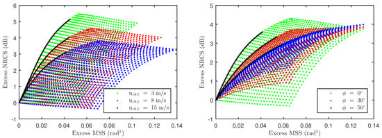 The distribution of excess MSS and NRCS versus wind speed (at ) and relative azimuth (at m/s) are shown in (left) and (right) plots, respectively. The leading edge of each surface, approximated using 4th-degree polynomial, is indicated using black curves.