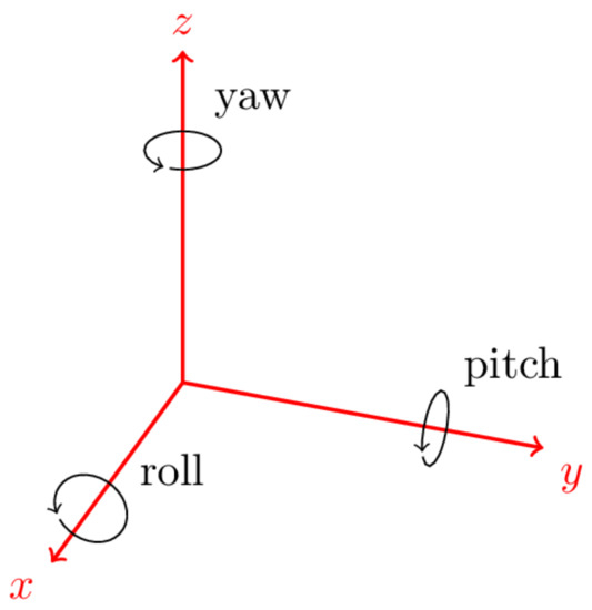 The rotation matrix R n b , mapping the navigation frame n to the body frame b, can be represented by ϕ (rotation angle along the x-axis), θ (rotation angle along the y-axis), and ψ (rotation angle along the z-axis), as follows (trigonometric functions s i n and c o s are denoted as s and c, respectively):