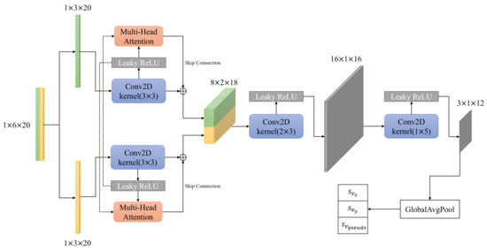 Figure 2 shows the CNN architecture used to predict parameters s v and s v p s e u d o . A window size of 20 IMU data points was used for the input. Each IMU data point consists of acceleration and angular velocity data for the three axes (x,y,z). Using a single channel, where the overall input dimension becomes 1 × 6 × 20 , the input is initially split into its individual acceleration and angular velocity matrices, which are processed separately by their respective 3 × 3 convolution layers followed by a leaky ReLU activation (ConvLR block). Then, a multi-head attention (MHA) layer is introduced to model the feature-fusion data. The output of the individual paths is then concatenated and processed by two more ConvLR blocks and a global average pooling layer. The final result is the three parameters s v x , s v y , and s v p s e u d o .