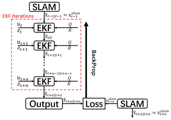Figure 3. Structure and training flow of our network. The initial state of the EKF iterations is based on the previous SLAM state update at timestamp t − 1. N number of EKF iterations will be performed until the next update of the SLAM state at t + n. The loss is calculated between the SLAM state update and the final predicted output state of the N EKF updates. Then, backpropagation is performed on the basis of the calculated loss.