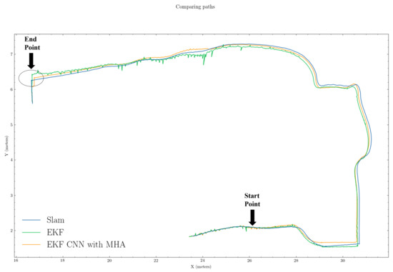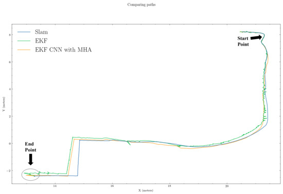 In Figure 5 and Figure 6, the period from when SLAM failed (“Start Point”) to when SLAM recovered (“End Point”) were regarded as the SLAM failure period. The green and orange paths represent the estimated position from the untrained EKF and EKF CNN with MHA, respectively, while the blue path (ground truth) is from the SLAM outputs.