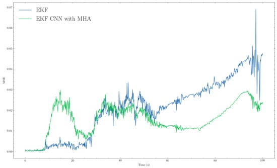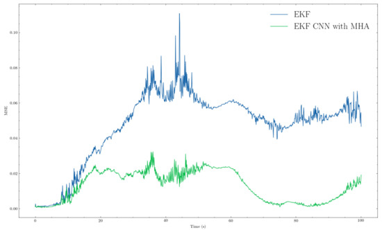Figure 8. The Mean Squared Error (MSE) comparison between EKF and EKF+CNN with MHA for trajectory 3. Blue and green lines represent EKF and proposed method, respectively.