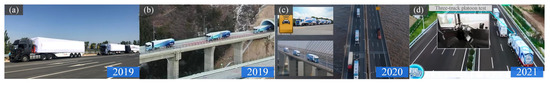 Automated truck platooning (ATP) is a new intelligent and green transportation technology [3]. The technology enables multiple trucks spaced at a close distance to optimize their aerodynamic characteristics, thus reducing fuel consumption [4] and carbon emissions [5]. Promoted by the vehicle-to-vehicle (V2V) [6] and the 5G vehicle-to-everything (5G-V2X) technologies [7], the following gaps between trucks can be further shortened and maintained to reduce the aerodynamic drag. In addition, ATP can also help improve road safety, save operating costs [4], reduce congestion [5], and indirectly solve many other traffic problems [8]. For these reasons, ATP has attracted increasing attention, and its commercial applications were recently tested in many countries [9,10], especially in China, as shown in Figure 1.
