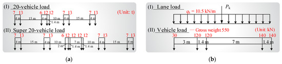 The large-scale construction of highway bridges in China started in the 1980s. The national bridge design and construction specification adopted back then was the “general specifications for design of highway bridges and culverts (JTJ 021—85)”, in which the “20-vehicle load” and the “super 20-vehicle load” were defined as the design vehicle load models for highway bridges, as shown in Figure 2a. These traffic load models had already considered vehicle platooning scenarios, but they can only represent the mixed traffic flow composed of different vehicles (including 2-, 3-, and 5-axle vehicles) spaced at 10 or 15 m. Such load models may not be able to fully characterize the load distribution of platooning heavy-duty trucks.
