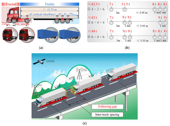According to the current legal limits (GB 1589—2016) [34] on masses and dimensions of a freight truck in China, three typical semi-trailer truck load models were developed, i.e., “4 × 2 + 6”, “6 × 4 + 4”, and “6 × 4 + 6”, as presented in Figure 3b. Here, “4 × 2” means that the tractor has four wheels, two of which are driving wheels; “+6” means that the trailer has six wheels (i.e., three axles). Based on the new regulations associated with overload vehicles, the upper limit of the gross truck mass for these three semi-trailer trucks is adopted as 42.5 t, 43 t, and 49 t, respectively. The upper limits on the total length, the front fitting radius, and the rear overhang of the semi-trailer are 13.75 m, 2.04 m, and 3.50 m, respectively. The axle spacing of the tractor and the axle-group spacing are assumed to be fixed at 3.00 m and 1.40 m, respectively. Then, the length ranges of the wheelbase were determined, as shown in Figure 3b.