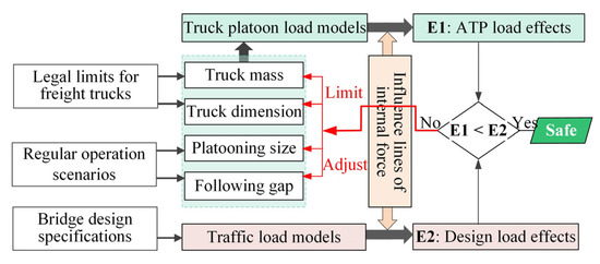 Figure 4 provides a flow chart of the assessment method adopted in this study. Based on the standard design load models and the ATP load models developed in Section 3, the corresponding load effects can be calculated using the influence lines of the bridge. By comparing the load effects due to the ATP loads with those due to the design vehicle (lane) loads [32], the loading conditions representing bridge safety margin can be identified, just as adopted by other studies [21,22]. These conditions can serve as essential references for rational traffic decision-making, including decisions on how to manage the platooning size and gaps and to what extent the masses and dimensions of trucks should be limited.