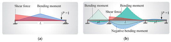 Small- and medium-span simply supported bridges and continuous bridges, which are sensitive to vehicle loads [35,36], were considered in this study. The influence lines of the bridges, which represent the relationship between the internal forces and the external loads applied to the bridges, were constructed based on the analytical expressions of the controlling internal forces, as shown in Figure 5. Specifically, for unequal-span continuous bridges (with a main span length of L and a side-to-main span ratio of μ), the analytical expressions of the influence lines were deduced for efficient evaluation. The accuracy of the deduction results was validated using the SM Slover software. As a case illustration, Figure 5b shows the influence lines of a three-span continuous bridge with a main span of 40 m and a side-to-main span ratio of 0.6.