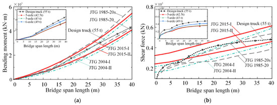 The maximum controlling internal forces calculated for the simply supported bridges are plotted in Figure 6. The main figures show the load effects due to the design vehicle loads in different bridge design specifications. The subgraphs plot the load effects due to a single-truck load, including the current design truck load (55 t). In both of the main figures and the subgraphs, the dashed lines with square markers represent the load effect due to the current design truck load (2015 version).