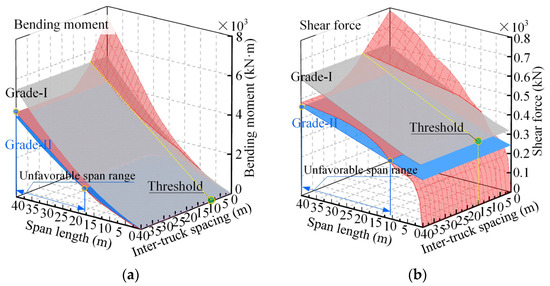 For Grade-I highway bridges, since the inter-truck spacing limits increase with the increase in bridge span lengths, the limit obtained from a 40 m simply supported bridge can reflect the minimum inter-truck spacing required to be maintained for the ATPs, which is called “inter-truck spacing threshold” in the following text. It can serve as a uniform guideline to control the minimum inter-truck spacing of the ATP on simply supported bridges. However, the obtained inter-truck spacing threshold only works for Grade-I highway bridges, as the load effects induced by the ATP on some Grade-II highway bridges can always be higher than those due to the design lane loads (2015 version). For these Grade-II highway bridges, the span range is called “unfavorable span range” hereafter and is illustrated in Figure 7. As can be seen from Figure 7, under the action of the two-truck (55 t) ATP loads, the unfavorable span range of simply supported bridges identified based on the bending moment is about 17–40 m, and that based on the shear force is about 11–40 m.