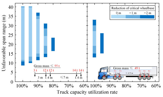 As mentioned previously, the unfavorable span ranges only exist in some Grade-II simply supported bridges. Figure 8 plots the unfavorable span ranges of Grade-II simply supported bridges under the action of ATP with different truck capacity utilization rates and different reductions in the critical wheelbase. In addition, only the unfavorable span ranges of the bridges under the action of ATP composed of 55 t design trucks and 49 t six-axle trucks are illustrated, because the two types of five-axle trucks even in a full load state will not lead to the unfavorable span ranges.