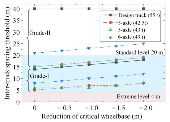 Figure 9 plots the inter-truck spacing thresholds for ATP crossing simply supported bridges with different reductions in the critical wheelbase. It can be seen from Figure 9 that the inter-truck spacing thresholds increase linearly with the reduction in the critical wheelbase because the reduction in the critical wheelbase causes a more concentrated distribution of the ATP loads. This emphasizes the necessity of prohibiting an over-short critical wheelbase for platooning trucks.
