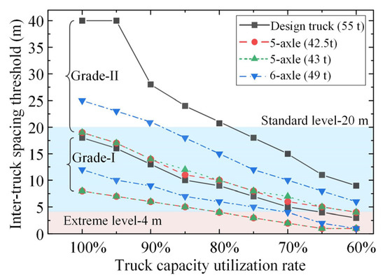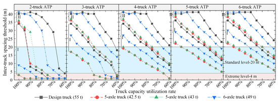 Figure 10 plots the inter-truck spacing thresholds for ATP crossing simply supported bridges with different truck capacity utilization rates. Since the inter-truck spacing thresholds are not further affected by the ATPs composed of more than two trucks due to the limit of bridge span length, the analyses were based on the shear forces of the simply supported bridges under the action of two-truck ATP loads, and a reduction of 2 m in the critical wheelbase was considered. It can be seen from Figure 10 that the inter-truck spacing thresholds gradually decrease with the decreasing truck capacity utilization rate, indicating that all highway bridges can accommodate ATP loads as the capacity utilization rate of each platooning truck, which reflects the truck weight, is reduced to a certain value. Under the same ATP loads, the inter-truck spacing thresholds identified for Grade-II highway bridges are higher than those identified for Grade-I highway bridges, especially for the ATP loads consisting of 55 t and 49 t truck loads. Specifically, inter-truck spacings larger than 20 m can be adopted for both types of five-axle trucks with gross masses below 43 t. As for the six-axle truck, if this type of truck has to be applied in the ATP with an inter-truck spacing as small as 20 m, it is only suggested to be implemented on Grade-I simply supported highway bridges unless its gross mass is reduced to below 44.1 t (corresponding to a capacity utilization rate of 90%). If this type of truck under full load has to be applied on Grade-II simply supported bridges, the minimum inter-truck spacing of its corresponding ATP should be strictly controlled to be larger than 25 m.