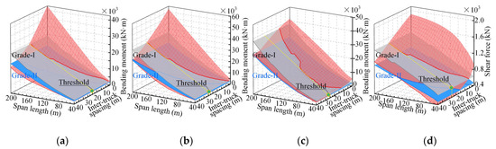 In addition to simply supported bridges, continuous bridges were also considered. Figure 11 provides 3D surfaces for the load effects of ATP on three-span continuous bridges. The side-to-main span ratio of these continuous bridges was 0.7. Only the load effects (four controlling internal forces) due to four-truck (55 t) ATP loads were presented for illustration. It can be seen from Figure 11 that all four controlling internal forces due to the design lane loads (2015 version) are significantly exceeded by those due to the ATP loads and that adjusting the inter-truck spacing may be a good choice to reduce the load effects.