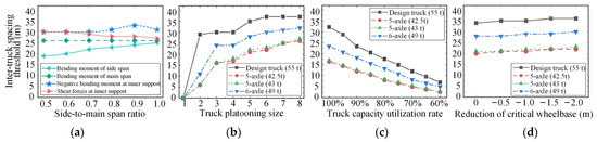 Parametric analysis of inter-truck spacing threshold: (a) effect of side-to-main span ratio; (b) effect of truck platooning size; (c) effect of truck capacity utilization rate; (d) effect of reduction in the critical wheelbase.