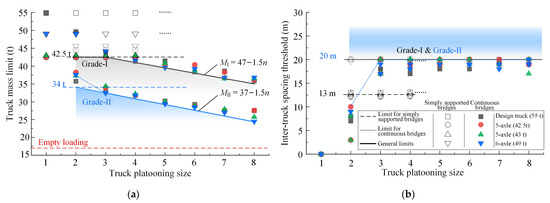 According to Equation (2), if the truck platooning size does not exceed three, the truck mass limit can be uniformly taken as 42.5 t, which is equal to the current legal upper mass limit for five-axle trucks [34]. Therefore, it is recommended to limit the truck platooning size to three trucks. The general upper mass limits suggested for other scenarios of ATP crossing highway bridges can be taken according to Equation (2). For the same ATP configurations, the general mass limit suggested for Grade-II bridges is lower by 10 t than that suggested for Grade-I highway bridges.