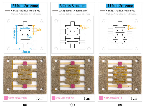 Kirigami-inspired cutting patterns (top) and photos of the wire connector ports (bottom) of sensors. (a) Sensors with two-unit kirigami structure; (b) Sensors with three-unit kirigami structure; (c) Sensors with four-unit kirigami structure.