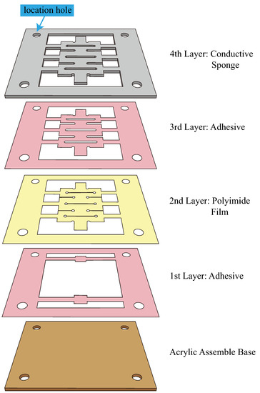 The sensors were fabricated based on the planar fabrication paradigm [36,37,38]. Laminates of materials and fabrication sequences are shown in Figure 2. A laser cutter (CMA960, YUEMING Laser, China) was employed to cut the desired patterns on the laminate materials to ensure the consistency of the sensor’s performance. Location holes and well-fitted steel location pins were employed to improve the assembly accuracy further. A 170 m, double-sided, pressure-sensitive adhesive (300LSE, 3M Company, Maplewood, MN, USA) layer was used to integrate the polyimide film and conductive sponge layer. The same adhesives were employed to stick the sensors to the attached objects. After the assembly, brass electrodes were stick to the two ends of sensor bodies using silver conductive adhesives (3703, Sinwei, China); the servo structure (shown at the top of Figure 1) of the sensors was then removed; and the sensor’s body was stuck to actuators using silicon adhesives (Sil-poxy™, Smooth-On, Inc., Macungie, PA, USA). The photos of actuators with kirigami-inspired flexible sensors are shown in Figure 3.