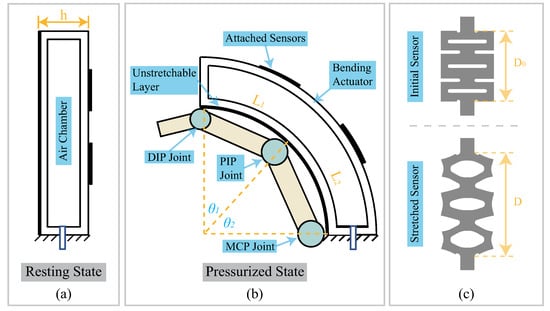The relationship between the deformation of the kirigami-inspired flexible sensors and the bending angles of the actuator was developed. A schematic diagram of the actuator integrated with sensors is shown in Figure 4. Since a soft fiber-reinforced bending actuator is commonly used in rehabilitation applications [39,40], a schematic finger with joints is also presented. The bending actuator could be simplified using either the constant curvature (CC) model or piecewise constant curvature (PCC) model. When the actuator is with the PCC model, it would be divided into two pieces, where the boundary is the contacting point of the finger’s proximal interphalangeal (PIP) joint. Therefore, for every bending angle (), we have that