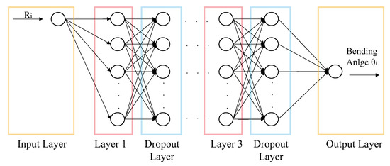 In this section, the design of the calibration neural network is presented. In Section 1, we mentioned it was necessary to use a data-driven method to calibrate the sensor made of a hyperelastic material that could handle the problem of hysteresis. In this work, a LSTM calibration neural network was designed to map the resistance of sensors to the bending angle of the soft bending actuator. The structure of the neural network is shown in Figure 5. It comprises an input layer, an output layer, and three hidden layers (each contains 100 hidden units). Early stopping (200 epochs) and dropout layers (0.1 dropout rate) are also utilized in the neural network to prevent the problem of overfitting (similar strategies were adopted in [4,22]). The inputs of the neural network are the sensing signals from the sensors. When the soft bending actuator is simplified using the constant curvature (CC) model (i.e., the actuator was treated as a whole part), the output of the neural network would be the overall bending angle of the actuator, and the neural network inputs would be the sensing signals of two sensors (all-to-one mode). If the actuator-simplifying model is the PCC model, there would be two individual LSTM calibration neural networks. For each of them, the inputs are the sensing signals of a specific sensor, and the outputs are the bending angle of corresponding segments (one-to-one mode). In Section 3, the performances of the calibration neural networks in these two modes are illustrated.