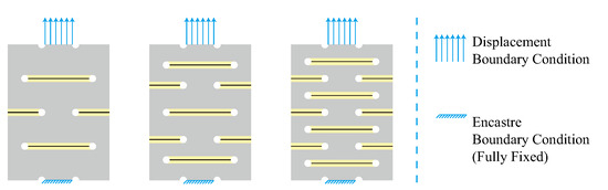 Finite element analysis (FEA) was performed to determine sensors’ stress/strain distribution during stretching. The finite element software Abaqus 2021 (Dassault Systemes Simulia Corp, Providence, RI, USA) was used to examine the strain within the kirigami structure. The Yeoh 3rd-order hyperelastic model with the coefficients from Szurgott’s work in 2019 [41] were used in the model of the polyurethane (PU) sponge (presented in Table 1). The polyimide film was modeled as an elastic material with material properties (E = 3.13 GPa, Poisson ratio = 0.3) determined in Qu’s work in 2017 [42]. A nonlinear static simulation was conducted. Consistently with the experiment setup, one end of each of the sensors was fully fixed with an encastre boundary condition, and the other end was stretched with a displacement of 10 mm (50% deformation ratio) in y direction (areas for electrodes were excluded). The positions of the constraints and loads are shown in Figure 7. A tie constraint was set between the sponge layer and the polymide film. The model was simulated with reduced integration (mesh type: C3D8R) and 0.5 mm mesh size.