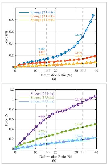 Results of the sensor stretching experiment. (a) Experimental results of the conductive sponge material. (b) Experimental results of the conductive silicon material. Resistive force of the sensors at a 16.7% deformation ratio (respective to a 45 actuator overall bending angle) and 33.5% deformation ratio (respective to 90 actuator overall bending angle) are indicated.