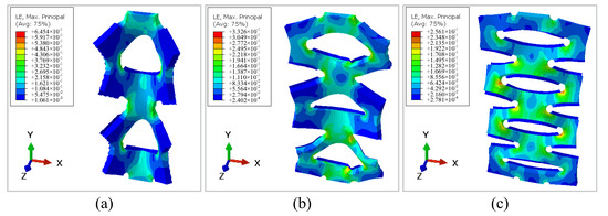Finite element analysis (FEA) results of kirigami-inspired flexible sponge sensors with (a) a two-unit kirigami cutting pattern, (b) a three-unit kirigami cutting pattern and (c) a four-unit kirigami cutting pattern.