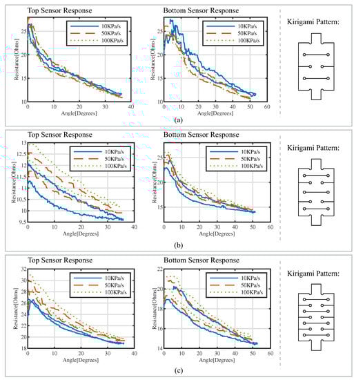 The resistance responses of kirigami-inspired flexible bending sensors with respect to the bending angles of the soft actuator were explored. For sensors with the same kirigami pattern, two sensors with identical appearances were stuck to the top and bottom surfaces of the bending actuator (shown in Figure 3) and connected to a voltage divider circuit ( = 20 ). During the experiment, the soft bending actuator was pressurized to 200 kPa and released at three different charging speeds (10, 50 and 100 kPa/s). An ADC module recorded the sensor signals with 16-bit resolution (ADS1115, Adafruit Industries, New York City, NY, USA). The sampling frequency is 20 Hz.