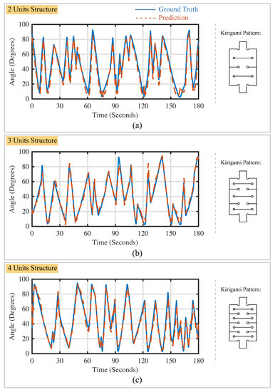 As mentioned in Section 2.1.3, the LSTM calibration neural network has two working modes (i.e., all-to-one mode and one-to-one mode). The performance of the calibration neural network in all-to-one working mode is shown in Table 2. The soft actuator bending prediction in a selected time region of three minutes is shown in Figure 11. The kirigami-inspired flexible bending sensor with the three-unit structure achieved the lowest root-mean-square error (RMSE) value (3.85) and the highest coefficient of determination () (0.97). When the LSTM calibration neural network is working in the one-to-one mode, the PIP joint angle and MCP joint angle are predicted by flexible sensors installed on the specific segments, separately. The performance of the calibration neural network in this operating mode is shown in Table 3. The finger-joint-angle prediction for the selected time period is shown in Figure 12. The time periods in Figure 11 and Figure 12 are identical for sensors with the same kirigami cutting patterns. It is noted that when two kirigami-inspired sensors located at the top and bottom of the bending actuator work together, the performance of the calibration neural network could be strengthened when compared with the performance of the sensor working individually.