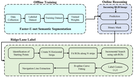 The navigation path recognition method between crop ridges proposed in this paper consisted of two parts: road semantic segmentation (offline training and offline reasoning) and navigation line extraction. The road semantic segmentation was based on the proposed Faster-U-net fully convolutional neural network to perform pixel-level recognition of information between ridges in crop images and obtain the corresponding mask regions. According to the semantic segmentation results, the B-spline curve-fitting method was used to extract the navigation path lines between the ridges of the robot. The key insight of the method presented in this study was to extract the traveling area as the region of interest (ROI). The navigation line was extracted in the ROI, as shown in Figure 1, and the flow chart of the entire navigation line extraction is presented in Figure 2.