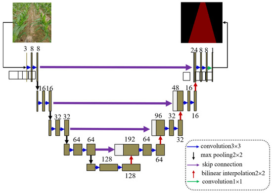 The overall structure of the U-net network is in the shape of a “U”, and the network structure is completely symmetrical. The feature map is dimensionally spliced by skip connection, which can retain more position and feature information. The segmentation performance is better than other network structures on small-sample datasets, and it is suitable for the semantic segmentation tasks of small-sized objects [17,28]. To satisfy the real-time requirements of weeding robot navigation path recognition, the U-net structure was optimized in this paper. Because the classification task of a weeding robot in the agricultural scene navigating between rows of crops is relatively simple [3], the number of convolution kernels and the number of feature maps in the forward-pass derivation process were reduced by 70%. The reduction in the parameters of the Faster-U-net model provided a guarantee for the real-time performance of path recognition. The network architecture of Faster-U-net is shown in Figure 4.