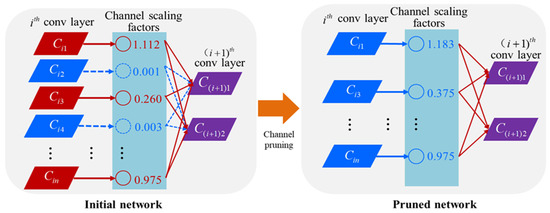 As shown in Figure 5, in the channel-pruning algorithm, the gamma coefficients of the batch normalization (BN) layer were used to evaluate the contribution scores of the input channels. According to the distribution of the gamma coefficients and the pruning rate of the channel-pruning algorithm, the channel with the large contribution (red solid line) was retained, and the channel with the small contribution (blue dotted line) was deleted. The neurons contributing to lower channels did not participate in the connection. In this study, the specific steps of channel pruning included the following aspects: