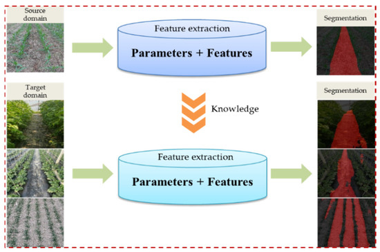 Transfer learning is a process in which a deep-learning model uses existing knowledge to learn new knowledge, and its core is to find the similarity between existing knowledge and new knowledge [29]. The existing knowledge in the transfer learning process is used as the source domain. As shown in Figure 6, the source domain in this research work was the feature space of the navigation path recognition dataset between corn ridges. The target domain was the feature space of the navigation path dataset between rows of crops, such as cucumbers, tomatoes, and wheat. The source domain data and the target domain data were different but related. A learning algorithm based on the generative model was introduced here, and the joint probability P(X,Y) was calculated first, and then P(Y|X) was calculated. In this way, the generative model provided a good mechanism. The different distributions of the source domain and target domain data could be modeled, and the knowledge transfer between the source domain and the target domain could be realized to improve the performance of the algorithm [30].