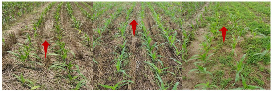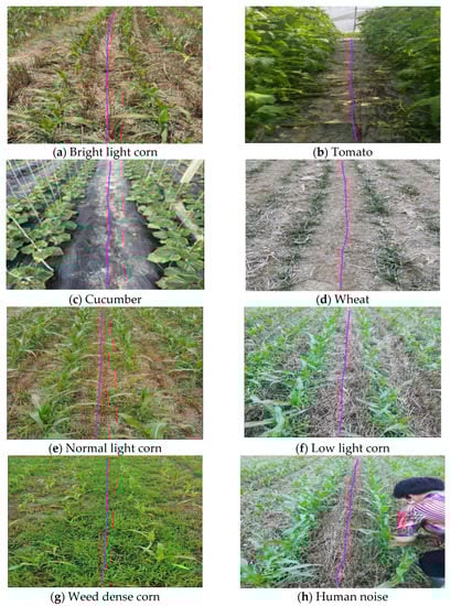 Lens model M1224-MPW2 of a Daheng camera was chosen as the vision sensor for this paper. When collecting, the vision sensor was installed on the mobile platform of a robot, and current crop images between the ridges were continuously collected when the mobile platform moved. In May 2021, the image data of tomato ridge rows at the mature stage were collected in a tomato-planting experimental field in the Bei chen District, Tianjin. In August 2021, the image data of corn plants at the jointing stage were collected in the Lingcheng District, Dezhou City, Shandong Province. In March 2022, the image data of cucumbers at the seedling stage were collected at a vegetable greenhouse planting base in Xin County, Liaocheng City, Shandong Province. By collecting images of crop rows under different weather conditions, different environmental backgrounds, and different light intensities, the characteristics of realistic field scenes in natural environments can be better highlighted, thereby improving the diversity and generality of the sample data. Then, 2000 images of the navigation path between corn ridges with a resolution of 1900 × 1180 were randomly selected from the collected data and annotated to generate a corn dataset; 1000 images of cucumbers between ridges, 1000 images of wheat between ridges, and 1000 images tomato ridges with the same resolutions were collected to generate the cucumber dataset, the wheat dataset and the tomato dataset, respectively. An example image is shown in Figure 3.