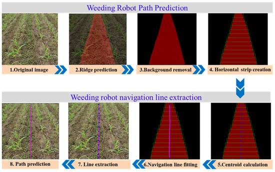 The application of autonomous navigation technology in weeding is the current development direction of precision agriculture. However, so far, the prevention and control of field weeds are mainly based on manual operations, which are inefficient. For the postprocessing process of robot navigation line extraction, in recent years, many scholars have developed machine-vision-based crop line and navigation path detection algorithms, among which the Hough transform and its variants, as well as least squares, are the mainstream fitting methods.