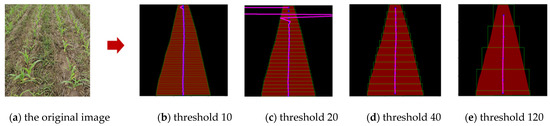 After the crop ridge prediction was completed, horizontal bands were created on the generated binary mask image to form the incremental search box of the sub-ROI. As shown in Figure 9, compared with the test results, when the threshold of the scanning rectangle frame was set to 40 pixels, the extracted navigation line could effectively reflect the path information of the crop ridges. The overall curve was smooth, and the calculated amount was relatively low. Therefore, the height of the rectangular frame was selected to be 40 pixels for research in the later stage.