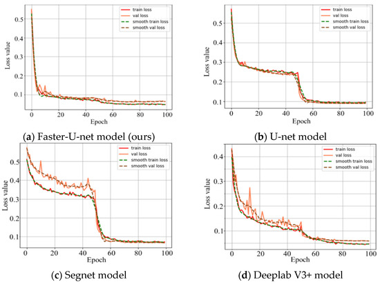 Model training loss function curves. (a) The loss function curve obtained based on the Faster-U-net model. (b) The loss function curve obtained based on the U-net model. (c) The loss function curve obtained based on the Segnet model. (d) The loss function curve obtained based on the Deeplab V3+ model.