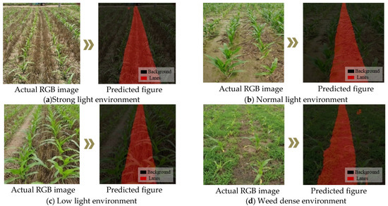 As shown in Figure 12, the network model based on Faster-U-net could correctly identify the ridges between crop rows, thus laying a foundation for the later extraction of navigation lines. Crop row images were acquired, and a mask was generated to predict the crop ridge. This mask was used to perform the navigation. The time consumption was 15 ms for a single-frame image binary mask. As shown in Table 3, the model segmentation accuracy results of the model under three conditions of weak light, normal light, and strong light were tested respectively.