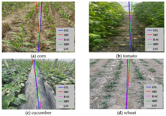 The network model based on Faster-U-net predicted the results of crop ridges and then extracted the navigation line of the weeding robot. Comparative experiments were carried out on maize, tomatoes, cucumbers, wheat, and four other crops using standard Hough transformation, B-spline curve fitting, median Hough transformation, least squares linear regression, and other line-fitting methods, as shown in Figure 13. In the figure, the red lines represent the fitting results of the standard Hough transform, the pink lines represent the fitting results of B-spline, the green lines represent the fitting results of the median-point Hough transform, and the white lines represent the fitting results of the least squares method.