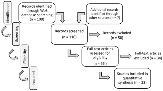 The database search results were concluded in January 2022, considering publications written in English as well as publications published between 2010 and 2022. Additionally, document types included in the performed search are proceedings papers, articles, and early access papers. The initial database search retrieved 109 publications. An additional seven records relevant to the topic were identified through other sources (e.g., manual search through references of relevant publications), and thus were included from the beginning of the process.