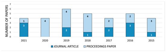 At the beginning of the analysis, publications were categorized by the year of publication and publication type. Although the literature search performed considered publications from 2010 onwards, among the papers included in the analysis there were no papers from the period from 2010 to 2014. Since 2015, the number of papers relevant to the topic of AR accessibility is between 4 and 6 through the years, with a slightly higher number of conference papers (62.5%) compared to journal articles (37.5%). Given this fact, we can say that the importance of this research topic has attracted the attention of the research community since 2015, which is not surprising because only then did handheld AR become more popular and affordable among the general public. The distribution of papers by year and type of publication can be seen in