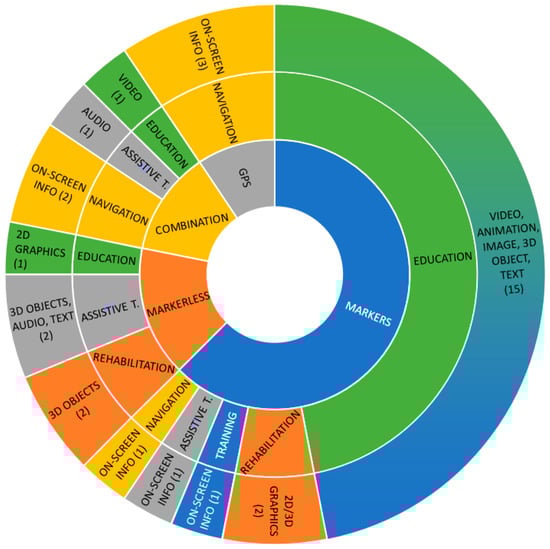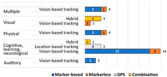 The most popular type of mobile AR solution for people with disabilities in the last decade is marker-based solutions, which use markers (different types of triggers) for establishing correspondence between the physical and virtual worlds. As with most solutions used in education, the majority of triggers for marker-based solutions are located in a textbook or electronic book, on flashcards or learning objects, or in the form of images associated with the learning material or other visual markers. The next-most popular type is location-based solutions used to support navigation or wayfinding. The primary trigger signal here is GPS, and this is also true for hybrid solutions that use inertial tracking triggers in combination. Very few solutions are based on markerless tracking, although this is a more flexible form of AR than the marker-based method. Considering that this technology is at present developed to improve the experience of AR and that it allows object occlusion, better immersion, and novel interactions, this tracking type should be better explored in terms of use by people with disabilities.