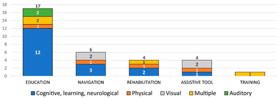 Considering that cognitive, learning, and neurological (CLN) disabilities can affect the ability to move, hear, speak, and understand information, this category includes the most diverse group of users, and most solutions are found for this category of disabilities. Solutions for visual impairments are found only in the navigation and assistive tool categories, meaning they are underrepresented in other application areas. In general, the technologies used for game development still do not provide adequate support for assistive technologies such as screen readers, and accessibility-aware developers must rely on their efforts to do something about it. Another complicating circumstance is that there are no guidelines or standards for how AR content can be made visible to assistive technologies. Therefore, additional efforts should be made to explore this area so that people with visual impairments can use applications in a variety of settings. The category for which the fewest solutions have been developed, and which therefore has the greatest potential for further research, is auditory disabilities. The reason for this could be that people who are deaf or hard of hearing can perceive information primarily visually, and many applications contain instructions only in text form. Content in text form is not useful especially for people who are deaf from birth, as they often cannot read. In this case, a highly simplified text, illustrations, or sign language can be helpful for them, which is difficult to implement in such a solution, especially considering that each country has its sign language or the content changes dynamically.