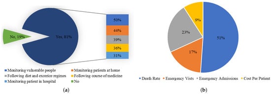 One of the best surveys on the consumer’s attitude toward the use of connected and wearable BAN health devices was carried out by Victoria Lambert [14]. This study was carried out on the people of the United Kingdom (UK) to assess how they see these devices being used in healthcare. It is a 2016 study, but it clearly predicts the future perspectives of the adoption of wearable BAN devices at individual, group (troops, BBN, etc.), and organization (hospital) levels. It shows that more than 80% of people want to have wearable BAN devices in healthcare systems. This study shows that different people are using these devices for different purposes, as shown in Figure 2a. Presently, it can be seen from the data how extensively these devices are being shipped and used.