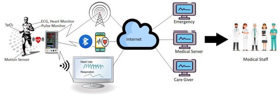 In the sequel to the figure, Figure 3 shows how data from a smartphone/gateway/ coordinator can be sent to a centralized repository (medical server) for medical and paramedical staff to take necessary decisions. This server might be cloud-based to provide 24 h service to different stakeholders [11]. A typical architecture of a wireless wearable BAN is shown in Figure 3. In this architecture, the communication system is divided into three layers as follows [25].