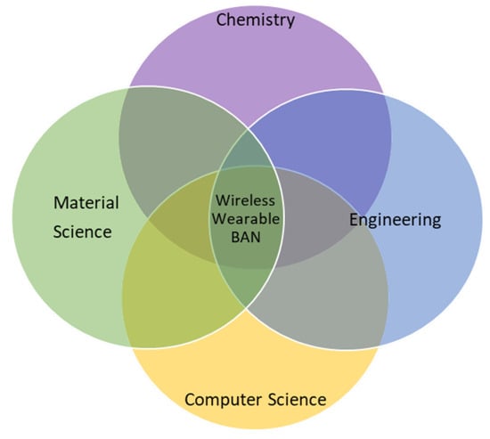 Wireless Wearable BAN Sensors are the product of collaborative and mutual research efforts of researchers belonging to different fields of science and engineering; Figure 4 represents this well. Each sensor in a wireless wearable body area network is completely provided with communication capabilities and can act as an autonomous device [25]. Wireless wearable BAN architecture that is used to send health information to remote medical servers can have different types of sensors. In this study, they are discussed on the basis of implantation and their functions. The discussion about them is equally beneficial for the wireless wearable BAN user, practitioners, engineers, and designers.