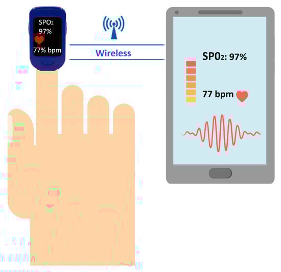 Oximeter sensors are used to find the oxygen absorption (saturation) level in body cells. Devices make use of the human fingertip to find the values. Oxygen absorption level is one of the critical vital signs that determines how well the oxygen is being provided to body cells by the red blood cells to keep them alive [60]. Low oxygen supply turns the red color of the tissue to blue, which means their life is shortening. It also greatly damages the functionality of your brain. The World Health Organization (WHO) has also provided a very good tutorial on using an oximeter on its website [61]. However, the detailed principles of the oximeter are beyond the scope of this study but can be retrieved from [62]. A well-known example of this device is the Welue O2 Ring Oxygen Monitor, which is shown in Figure 5.
