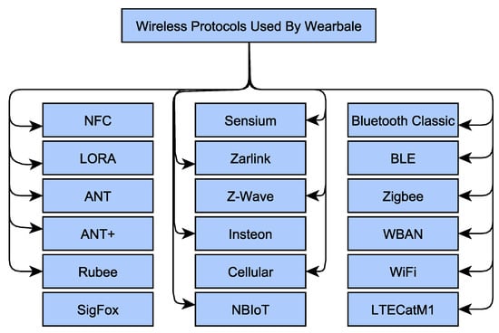 Looking at the above discussion on the nature of the WBAN devices, it can be concluded that the selection of wireless technology to be inducted for wearable or WBAN devices is very critical. Bandwidth, power, range limitation, and the nature of the application of wearable WBAN devices determine the type of wireless technology to be decided. Therefore, no single wireless technology satisfies all wearable WBAN applications and scenarios [71]. The most dominating wireless protocols in the WBANs, wearable or body-worn industry are Near Field Communication (NFC), Bluetooth Low Energy (BLE), Bluetooth Classic, Zigbee, 802.15.6 WBAN, WiFi, LoRa, ANT, ANT+, and Cellular [70,71,72,73].