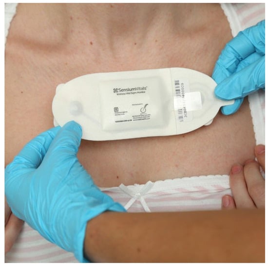 Sensium is a low-power on-body technology for steady monitoring and observing of patient health [75]. It can send information to smartphones, mobile phones, laptops, and PC devices wirelessly, which is sent to a medical entity (medical servers, doctors, paramedical staff) for further action. Sensium sensors become alive only when they have reached a time slot to transmit data; otherwise, they keep themselves in sleep mode to save energy [74]. Presently, Sensium is one of the most widely adopted patient health monitoring systems. Figure 7 is the real Sensium copyright picture in which the Sensium patch is being placed on the patient’s body for vital sign monitoring. We reproduced this picture from the open access article [57]. From this figure, the importance of wearable WBAN devices in terms of patient health monitoring can be imagined. This acted as one of the most promising technologies for remotely treating patients with COVID-19, where people were required to stay at home as much as possible.